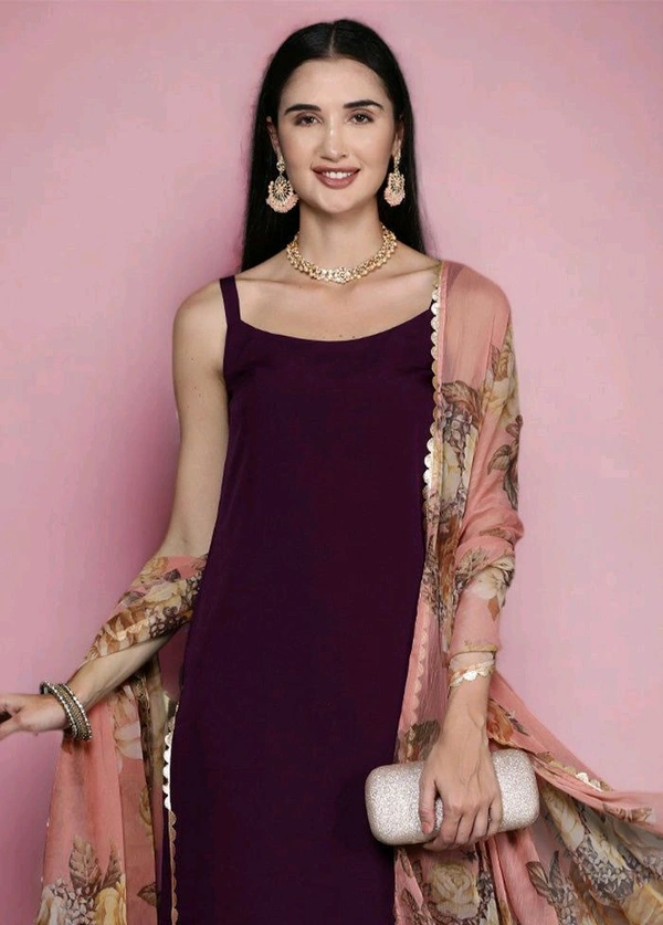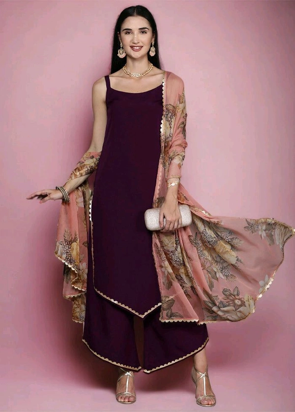 Update your wardrobe with this beautiful product. Introducing our exquisite burgundy color blended silk 3 pcs readymade suit set, a mesmerizing ensemble that exudes elegance and sophistication. Adorned with solid, it boasts undeniable charm. The set includes a matching dupatta and palazzo, offering both grace and comfort. Add some matching accessories to complete your look.