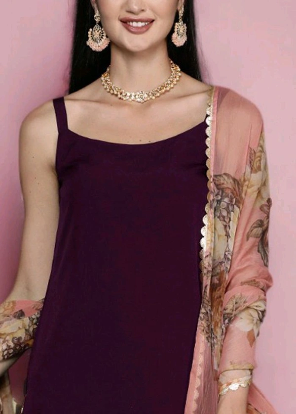 Update your wardrobe with this beautiful product. Introducing our exquisite burgundy color blended silk 3 pcs readymade suit set, a mesmerizing ensemble that exudes elegance and sophistication. Adorned with solid, it boasts undeniable charm. The set includes a matching dupatta and palazzo, offering both grace and comfort. Add some matching accessories to complete your look.