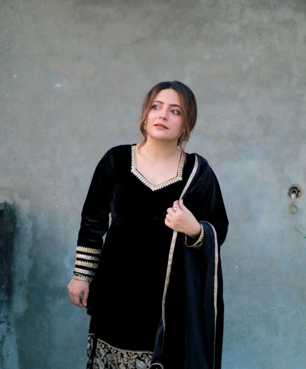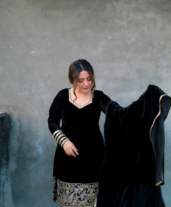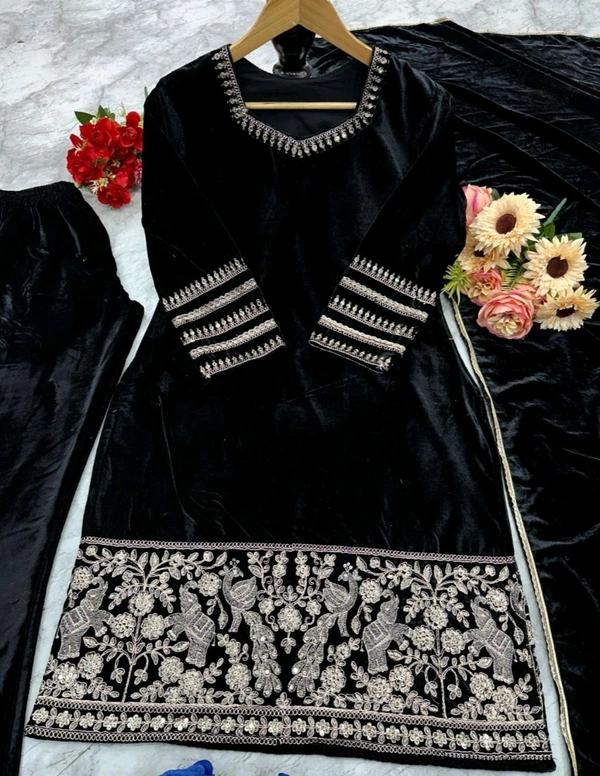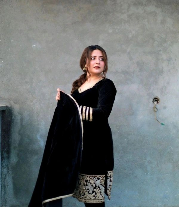 Black Velvet Winter Embroidered Kurta pant Dupatta set | Indian Ethnic Women Wear | Thick Festive Embroidered Kurti | Bollywood Formals