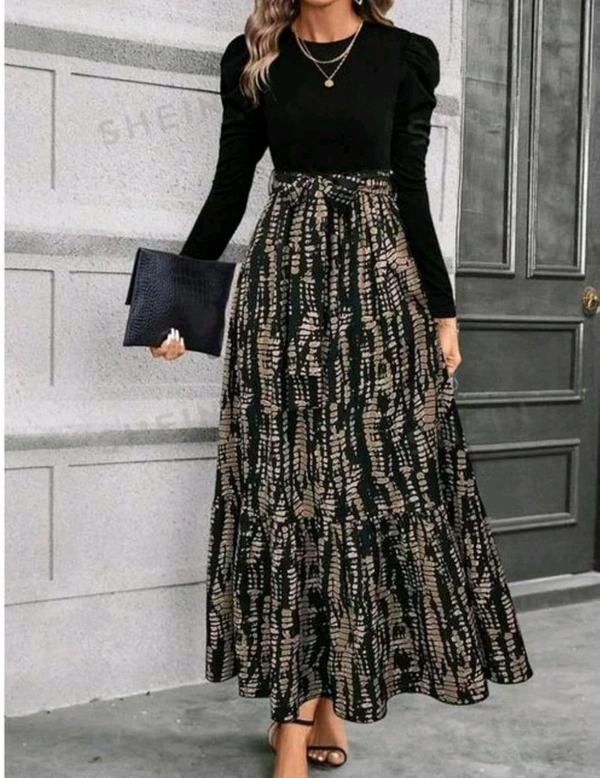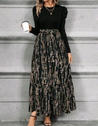 Clasi Women's Autumn Dress with Bow Tie Belt, Leaf & Floral Patchwork A-Line Dress Maxi Women Outfit Black