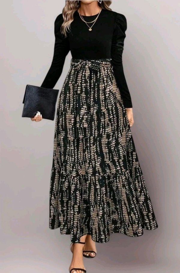 Clasi Women's Autumn Dress with Bow Tie Belt, Leaf & Floral Patchwork A-Line Dress Maxi Women Outfit Black