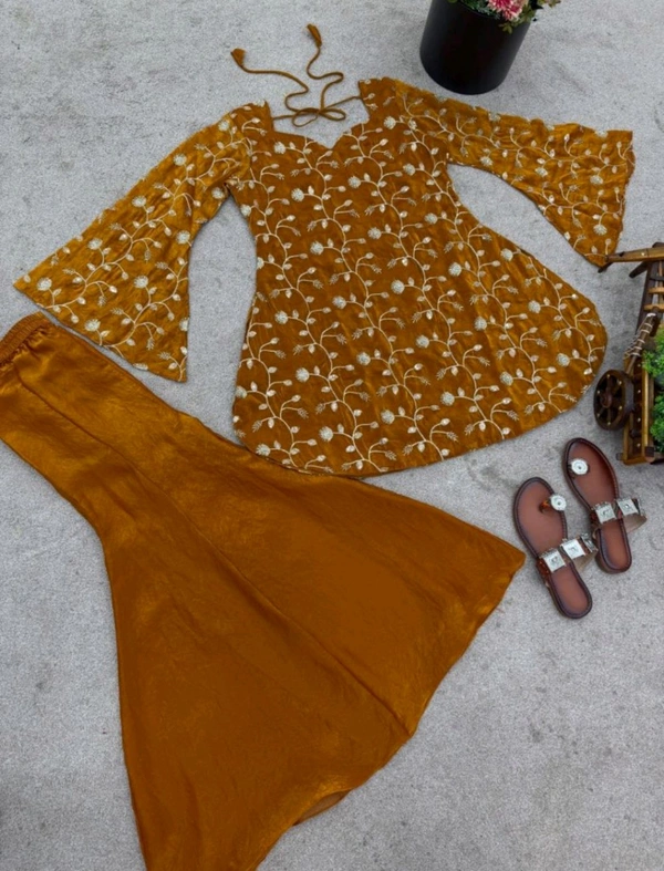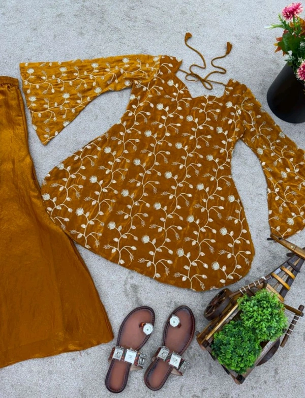 Fabric: Fandy silk with embroidery and sequin work. Inner fabric: micro cotton. Full sleeves. Length: 32–33 inches. Available sizes: M (38), L (40), XL (42), XXL (44).