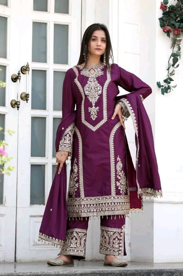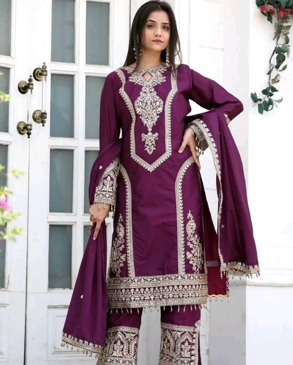 Heavy Chinon Silk kurti Eith Embroidered salwar And Dupatta Set