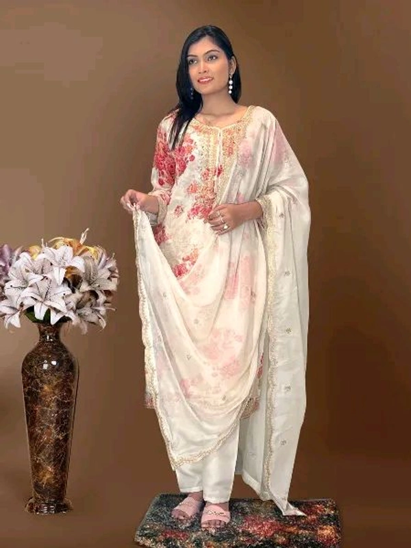 Off White Kurti Pant Set in Organza With Print Embroidery and Stone With Dupatta