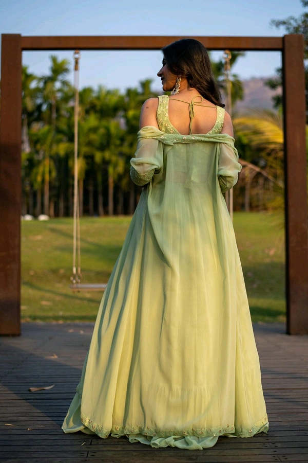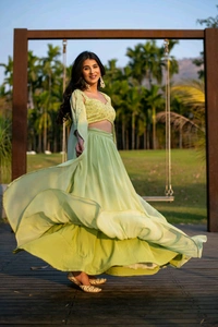 blouse, has a square neck, sleeveless Olive green solid ready to wear lehenga, flared hem Olive green solid jacket