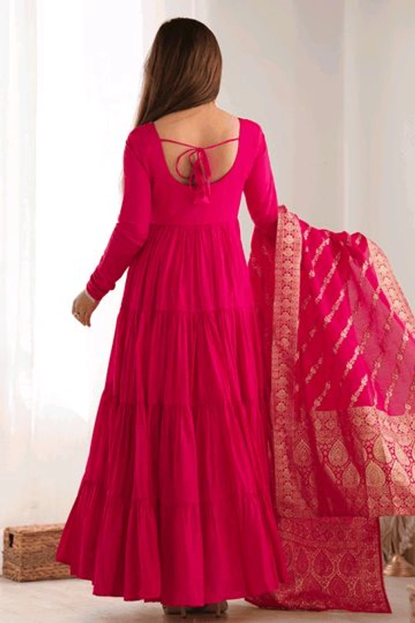 Our Unique Gown collection is more than just an outfit—it's a statement. Designed with pure roman silk chanderi fabric, both the gown and dupatta promise a perfect blend of comfort and luxury, making it easy to look chic while feeling at ease. The vibrant color designs bring a refreshing touch to your wardrobe, while the jackquard banarasi dupatta adds an element of sophistication. Whether it's a wedding, festival, or special occasion, this collection has you covered.