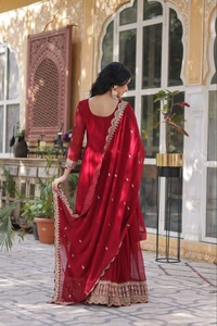 Stunning Ruby Red Faux Blooming Embroidered Gown designed with exquisite embroidery and a flattering silhouette. Crafted from premium faux fabric, this gown exudes elegance and charm, making it perfect for weddings, parties, and festive events.