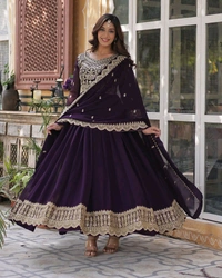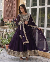 Stunning Ruby Red Faux Blooming Embroidered Gown designed with exquisite embroidery and a flattering silhouette. Crafted from premium faux fabric, this gown exudes elegance and charm, making it perfect for weddings, parties, and festive events.