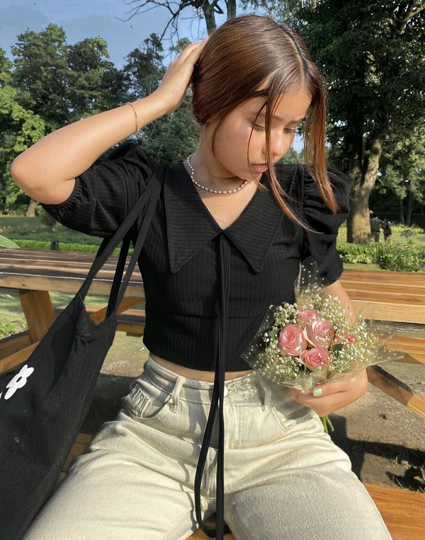 Style: Crop Half Sleeve Shirt || Work: Knitted, Solid