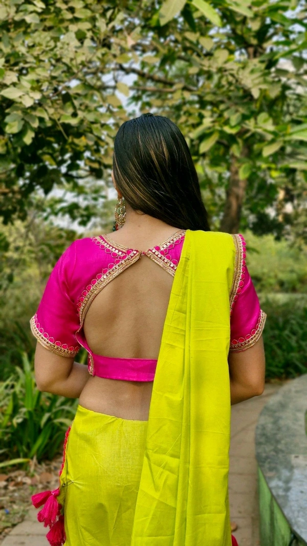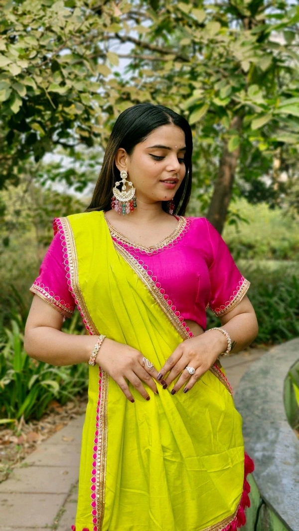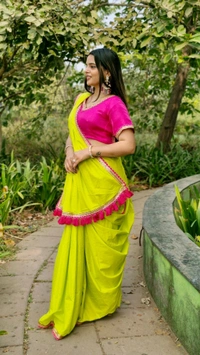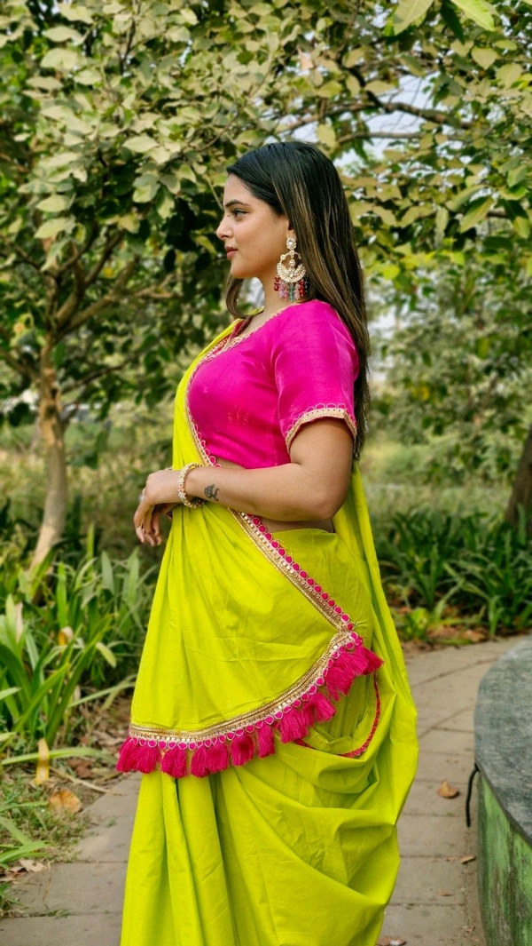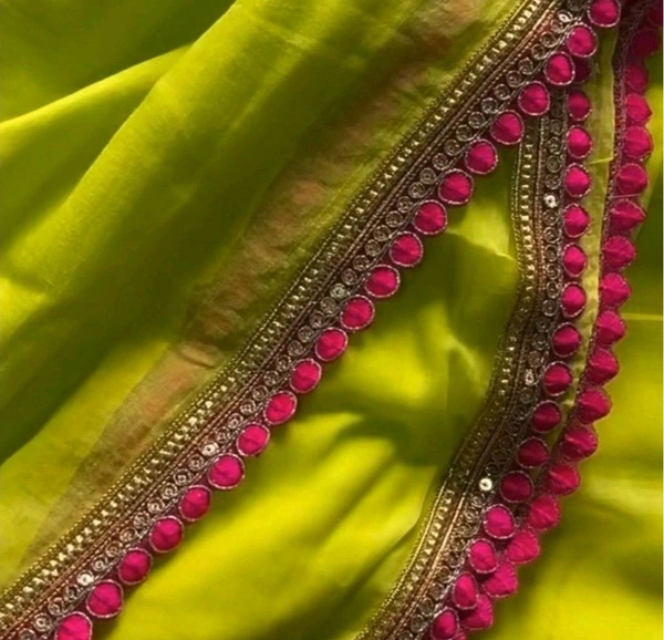 Embrace a burst of color with our Vibrant Lime Green Georgette Saree. The luxurious georgette fabric drapes beautifully, offering a comfortable and elegant feel. The solid lime green color is a showstopper, while the pink or magenta tone embroidered lace border adds a touch of playful contrast. The pallu is adorned with 25-30 tassels, creating a fun and festive look.