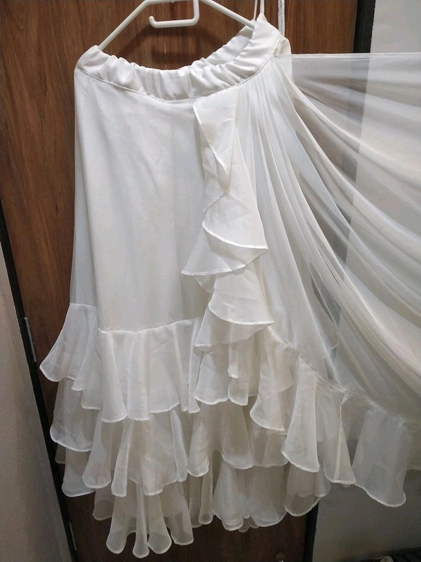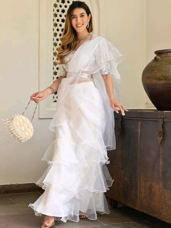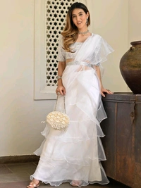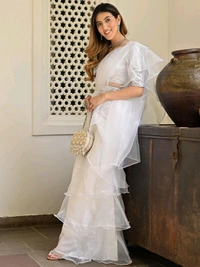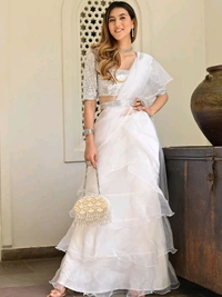 white ivory blue ruffle saree, pre stitched saree,pre pleated saree,ready to wear mehendi outfit,indo western woman outfit,bridesmaid dress
