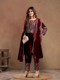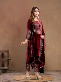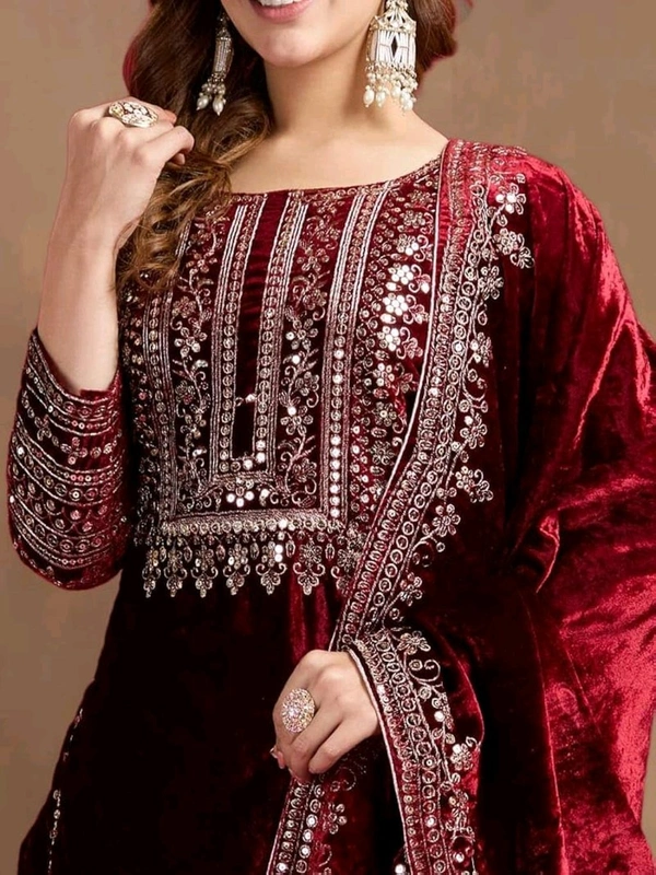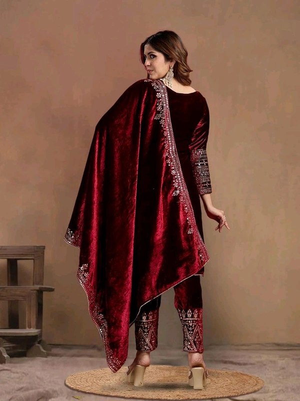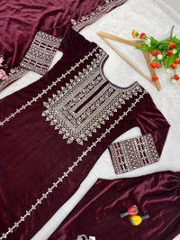 Women's Velvet Embroidered Maroon Straight Kurta Suit Set with Pant and Dupatta||Velvet Suit For Women||Velvet Kurta Set Women||Kurta Set For Women Winter